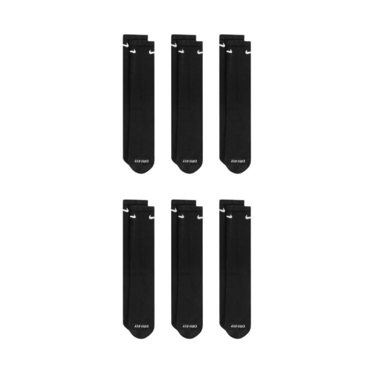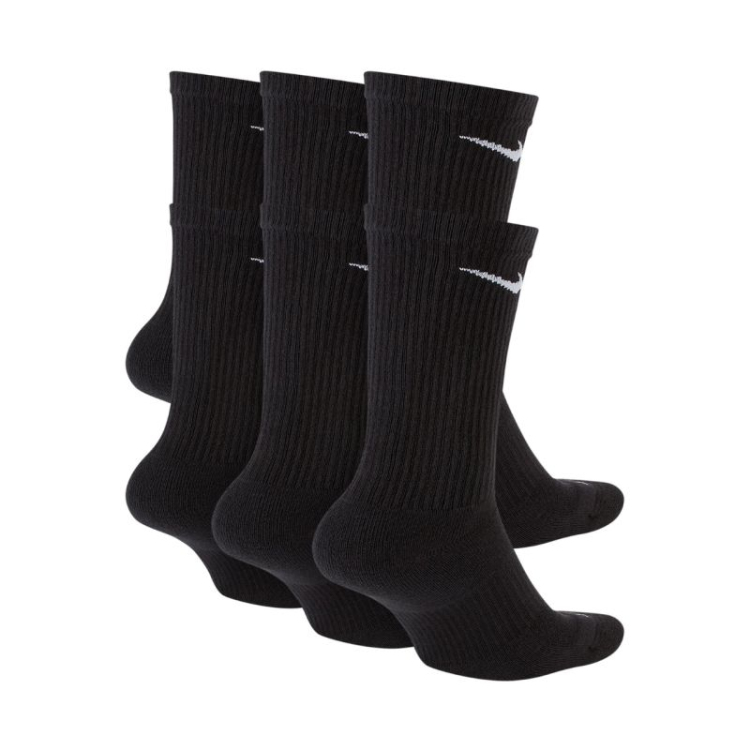 Nike Everyday Plus Cush zeķes, 6 pāri, melnas, SX6897 010. Šīs 1/3 ikru Nike zeķes palīdz justies ērti fizisko aktivitāšu laikā. To ergonomiskais dizains un izturīgie, elastīgie materiāli nodrošina elpojamību un mitruma pārvaldību. Dri-FIT tehnoloģija nodrošina elpojamību un mitruma pārvaldību. Īpaša lente cieši pieguļ pēdas velvei, lai sniegtu atbalstu. Amortizācija pēdas priekšdaļā un papēža daļā. Rievotā virsma neļauj zeķēm uzslīdēt uz augšu. Augšējie paneļi ir izgatavoti no smalkākiem pavedieniem, lai uzlabotu ventilāciju. Pastiprinātas papēža un purngalu zonas palielina izturību. Komplektā ietilpst 6 pāri. Materiāls: 61-67% kokvilna, 30-36% poliesters, 2% spandekss, 1% neilons.