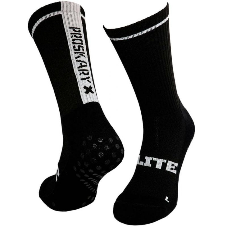 Proskary Elite senioru neslīdošas treniņzeķes, melnas. Proskary treniņzeķes ir paredzētas aktīviem futbolistiem, kuri novērtē augstu kvalitāti. Modelis ir izgatavots no elastīga auduma, kas ir izturīgs pret bojājumiem un drošs ādai. Neslīdošas gumijas lentes, kas pārklāj visu papēdi, nodrošina stabilitāti spēles laikā. Palielināta ventilācijas zona pēdas vidusdaļā. Bezšuvju konstrukcija. Pieejamas melnā krāsā ar baltām detaļām. Materiāls: polipropilēns, kokvilna, poliesters, elastāns.