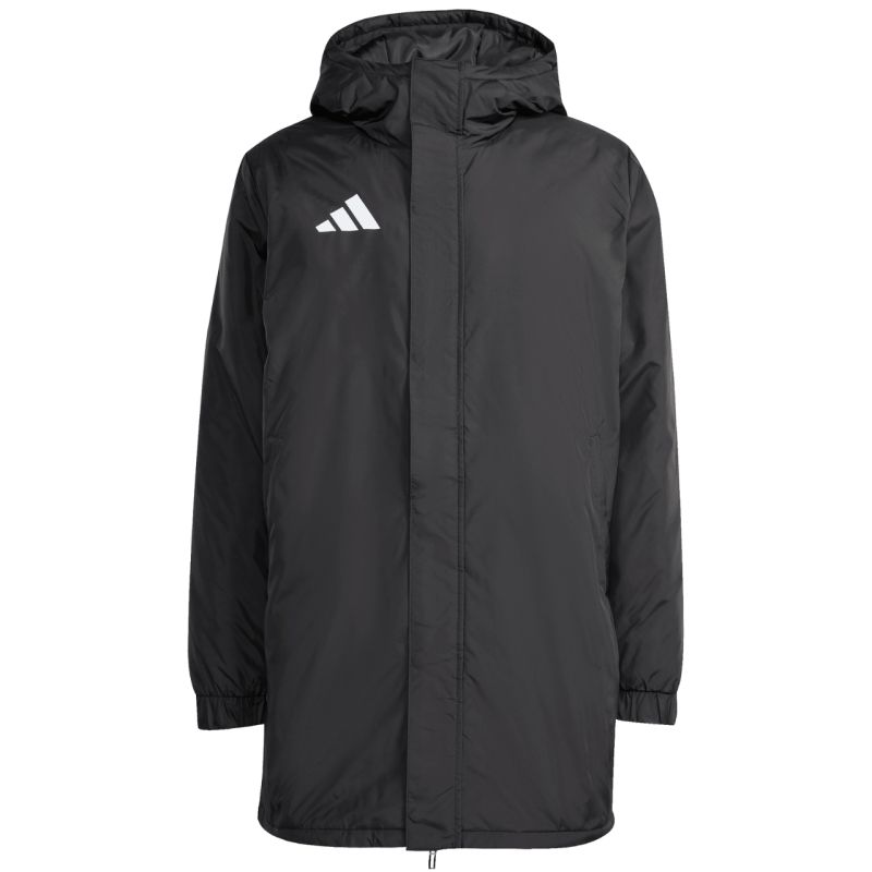 adidas Entrada 26 stadiona jaka, melna JZ6668. Šī adidas vīriešu jaka ir paredzēta atpūtai laukuma malā. Tai ir standarta piegriezums ar pilnu rāvējslēdzēju. Fiksēta kapuce. Sānu kabatas ar rāvējslēdzējiem. Aproces ar aprocēm. Vētras atloks ar spiedpogu. Sintētiska izolācija. Ārējais audums: 100% pārstrādāts poliesters. Pildījums: 100% pārstrādāts poliesters.
