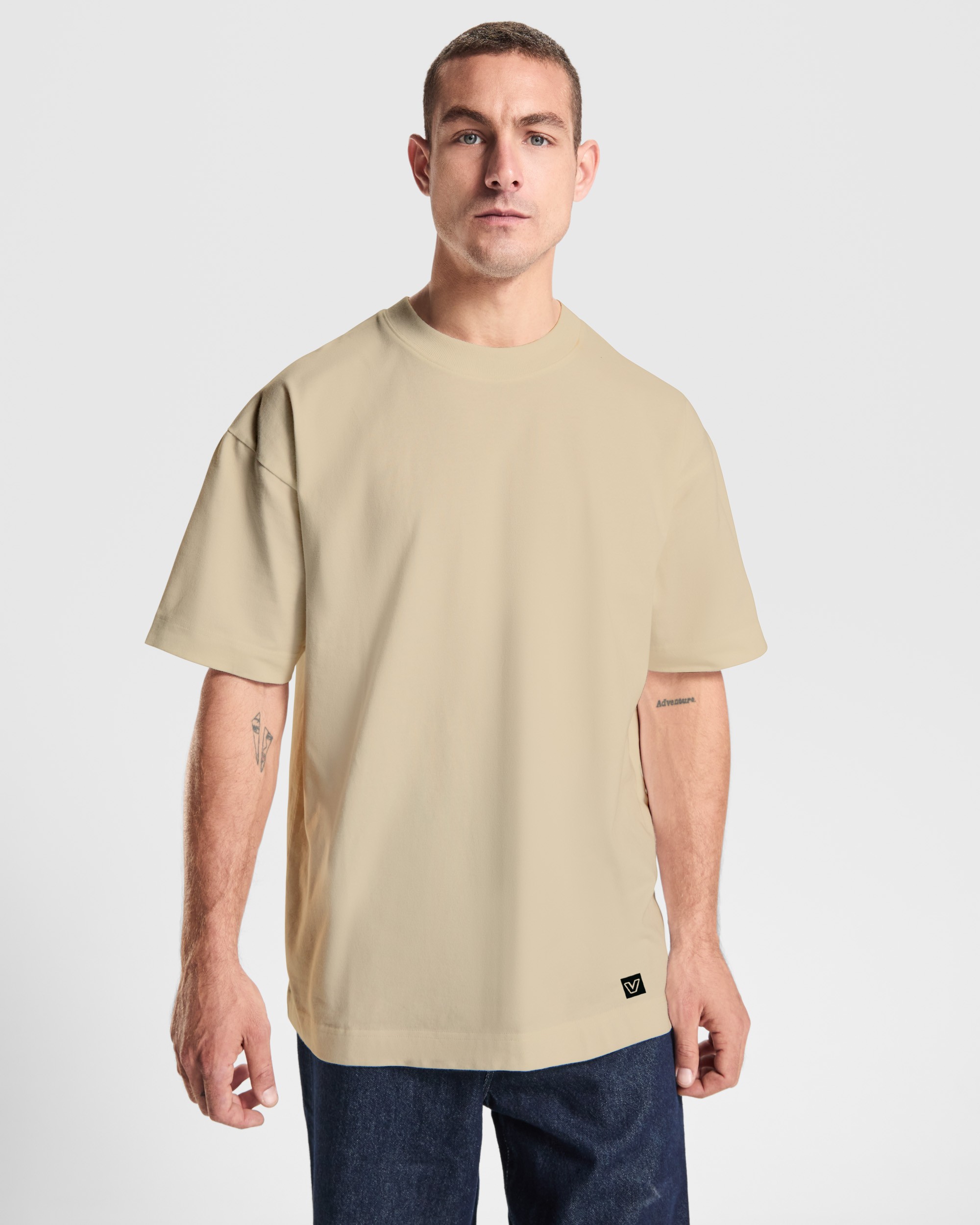 • Īsroku T-krekls no bieza auduma, brīva piegriezuma.
